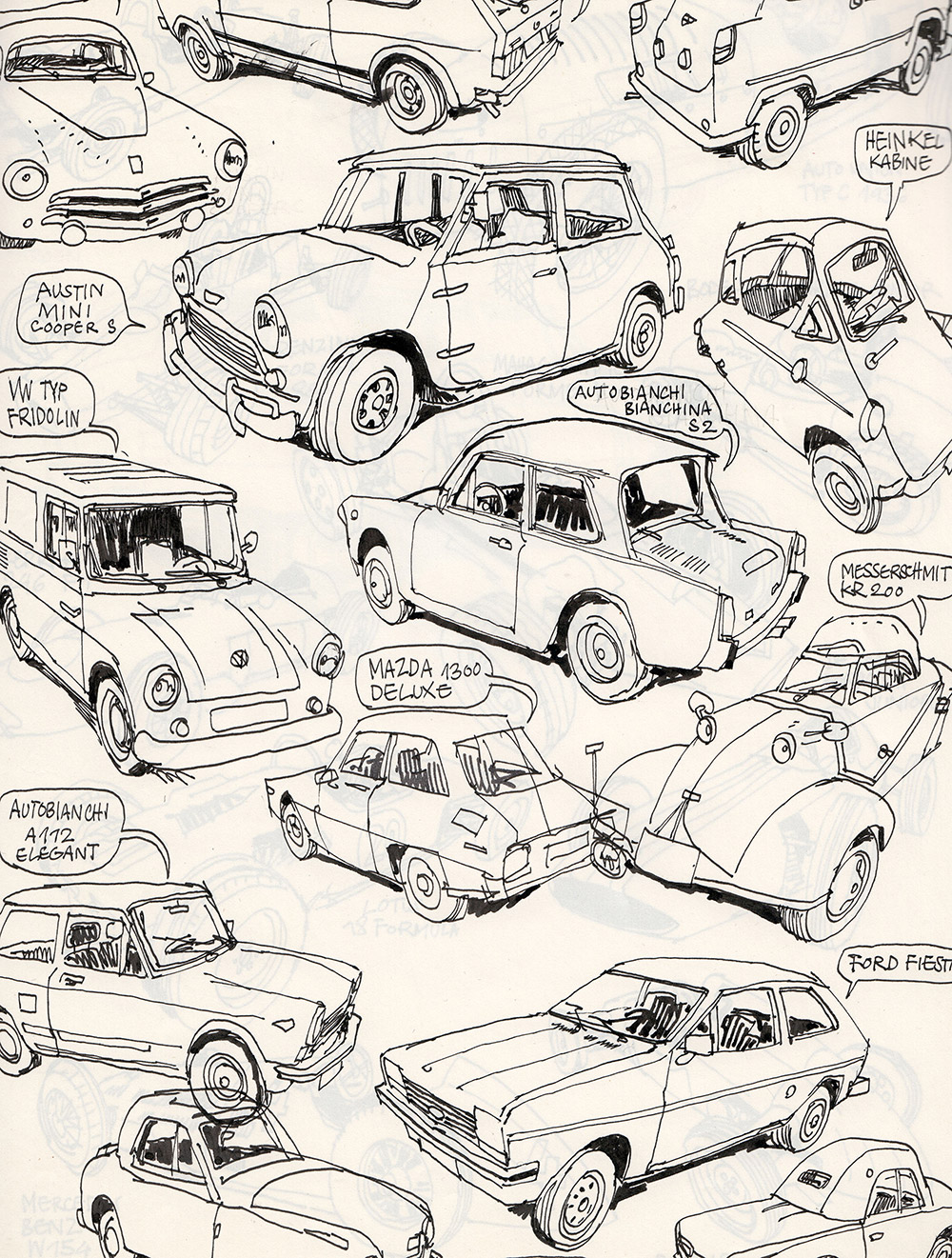 Autos gehören zu unserem Alltag – selbst wenn man keins besitzt – sie begegnen uns öfter als unsere Kaffeetasse. Warum also einem potentiellen Sujet ausweichen, nur weil ein Auto die Aussicht «verschandelt»? Wir alle haben Ausweichstrategien für Dinge, die wir nicht so gut können. Warum nicht das Auto zum eigentlichen Sujet machen? Im Falle eines tollen Oldtimers sind wir vielleicht dankbar, wenn wir uns mit dem Konzept Auto auseinandergesetzt haben und diesem mit Freude an lustigen Formen und ohne Ressentiments begegnen. Manchmal möchte man ein Auto auch nur schemenhaft darstellen, ohne auf Detailformen einzugehen.
