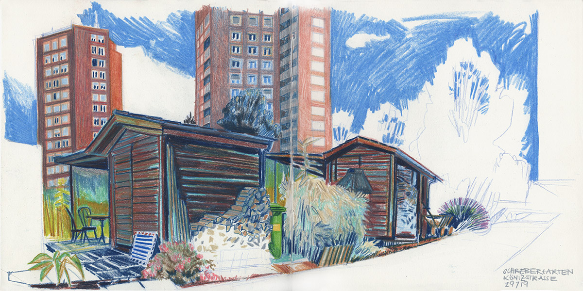 In this workshop we will work with coloured pencils: Drawing pencils, which we have all known since childhood. When sketching, we are on the one hand precise observers, on the other hand we interpret what we see and try to use colour in an unusual and courageous way. In doing so, we pay attention to the choice and composition of our colour palette, limit ourselves to a few shades and pay attention to our stroke.