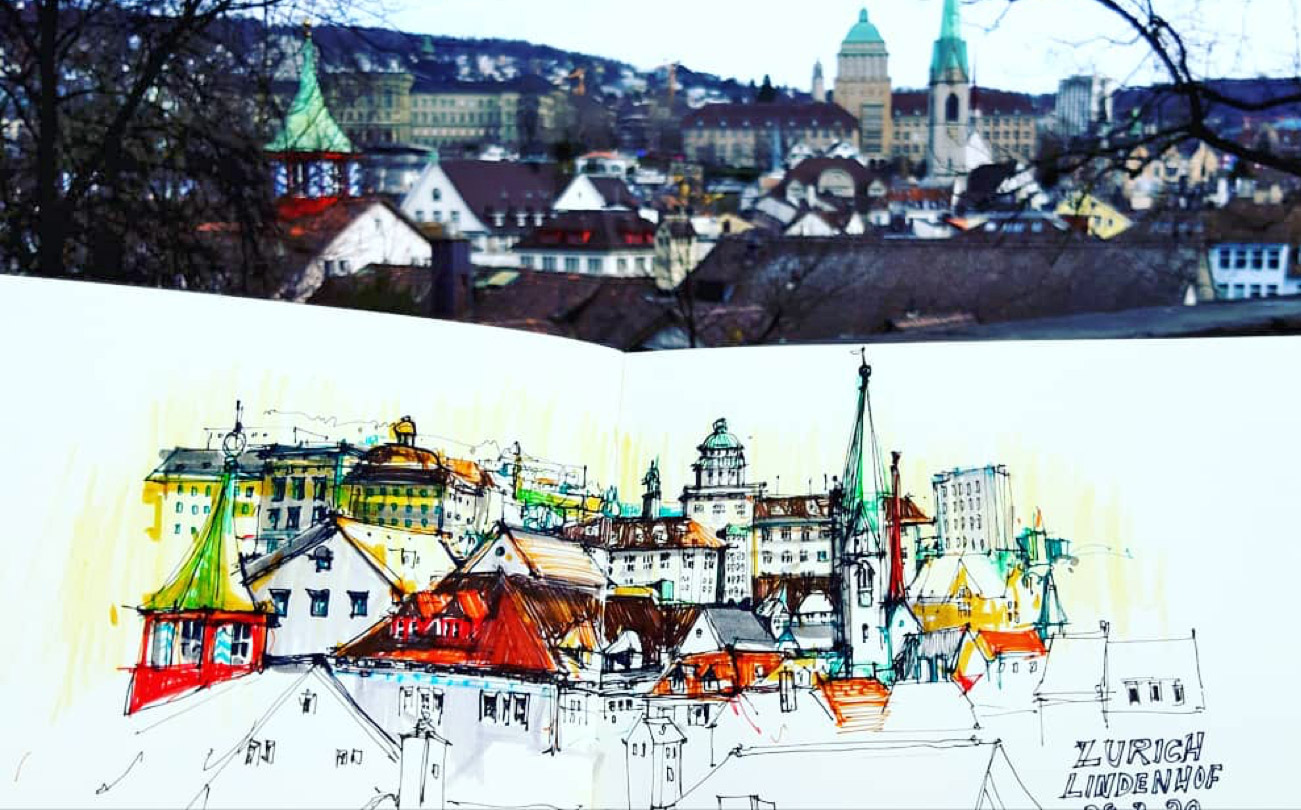 Brindarica Bose, is an Indian by birth and now a Swiss citizen. She works part-time in the publishing industry, and as an art teacher in Migros Klubschule. For her, urbansketching is like storytelling. She published a sketching book "Sketching Diaries" with four other Swiss artists in 2020. Her artworks are colourful and although watercolours are her first love, she loves mixing pencils, pens, crayons and anything that she can lay her hands on, while urbansketching. Her style is rather "fast and spontaneous" to capture the essence of a scene.