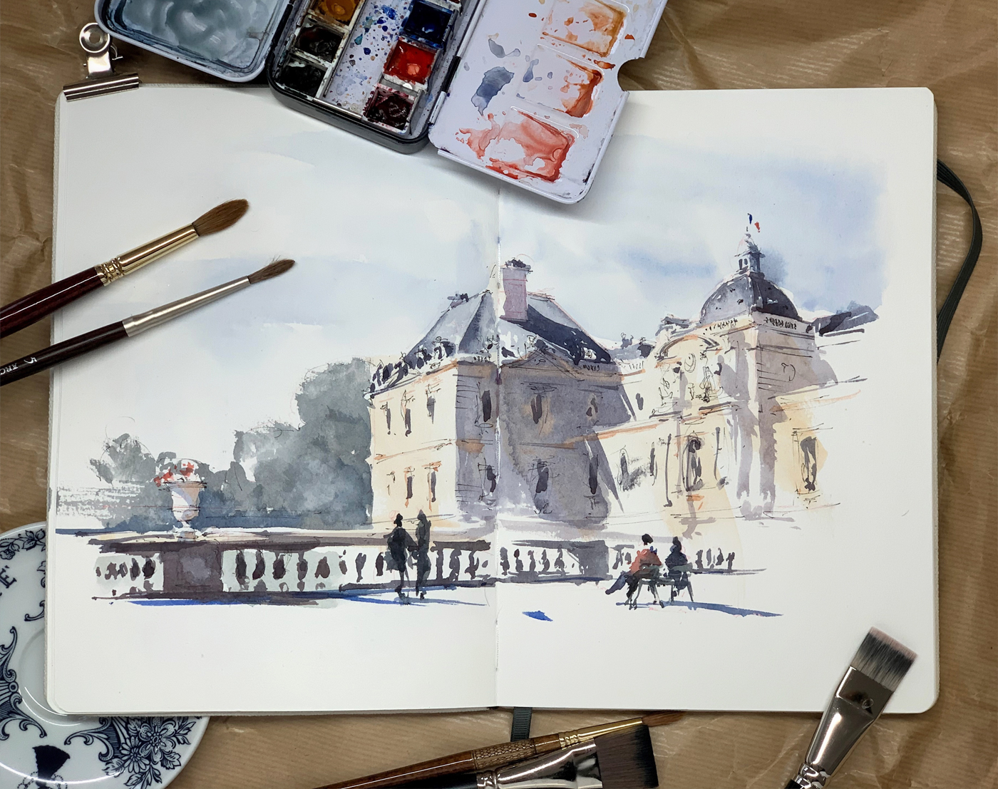 Alex Hillkurtz was born in England and grew up in California, where he established himself as a successful storyboard artist in Hollywood. Currently living in Paris, Alex is now a professional watercolor artist. He enjoys discovering aspects of the city that painting uniquely allows, using the language of cinema to inform his work.
