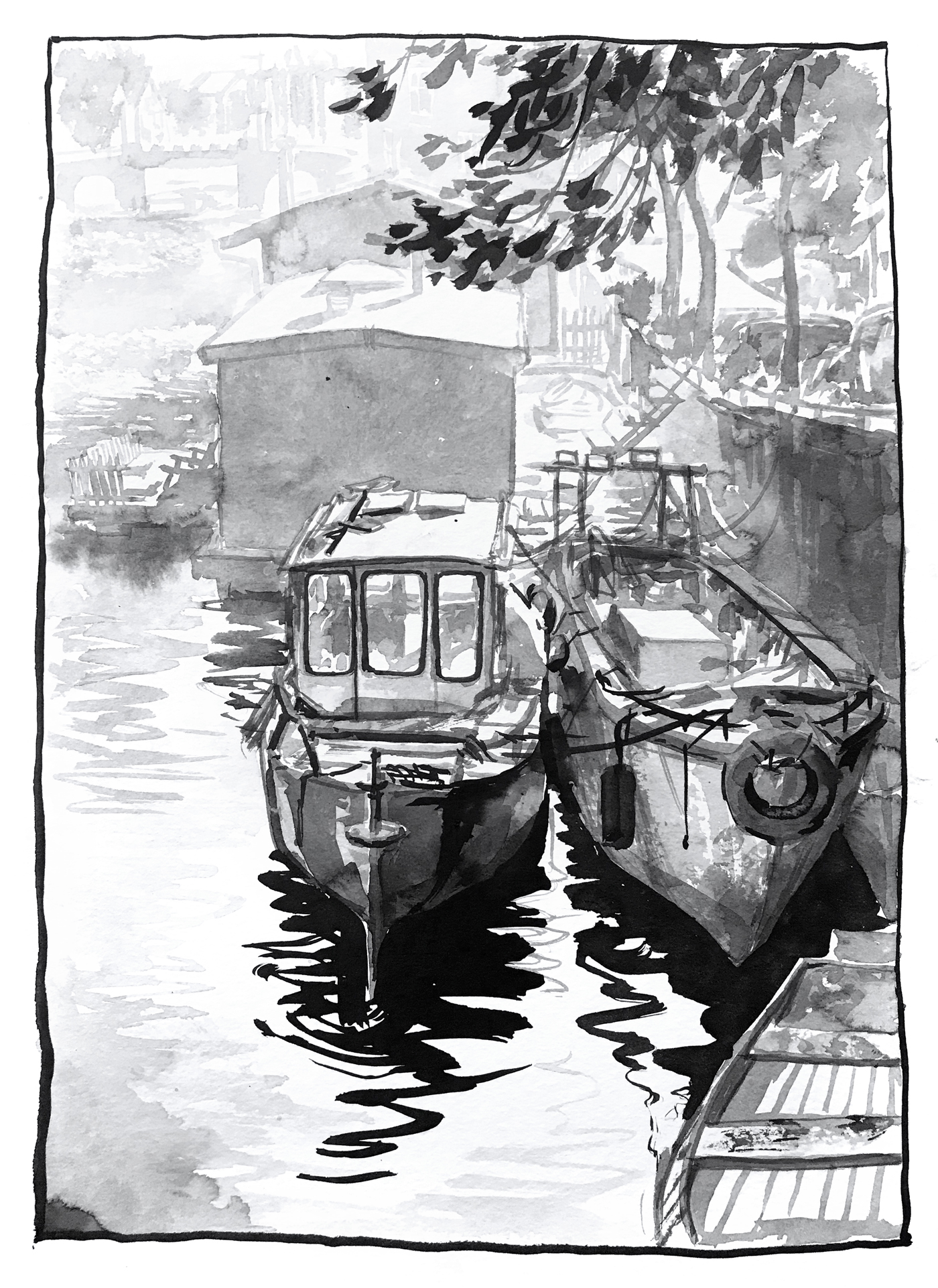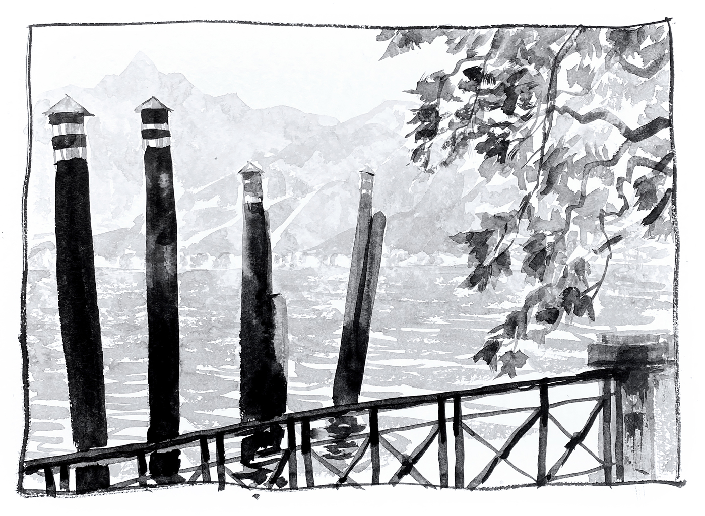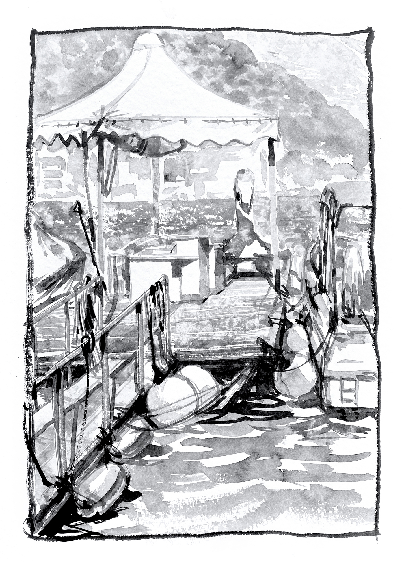 Catch dramatic clouds, glittering waves and oily reflections! Painting directly with Chinese ink may take a bit of courage, but once you discover the possibilities it is very satisfying. Don‘t be afraid to get a little dirty and gritty, let‘s mess around and see how we can catch a scene quickly by applying different kinds of loose brushwork. In this workshop we will discover that black ink is not only about strong linework, but also about delicate greys and everything in-between, which can add amazing depth to your sketch.