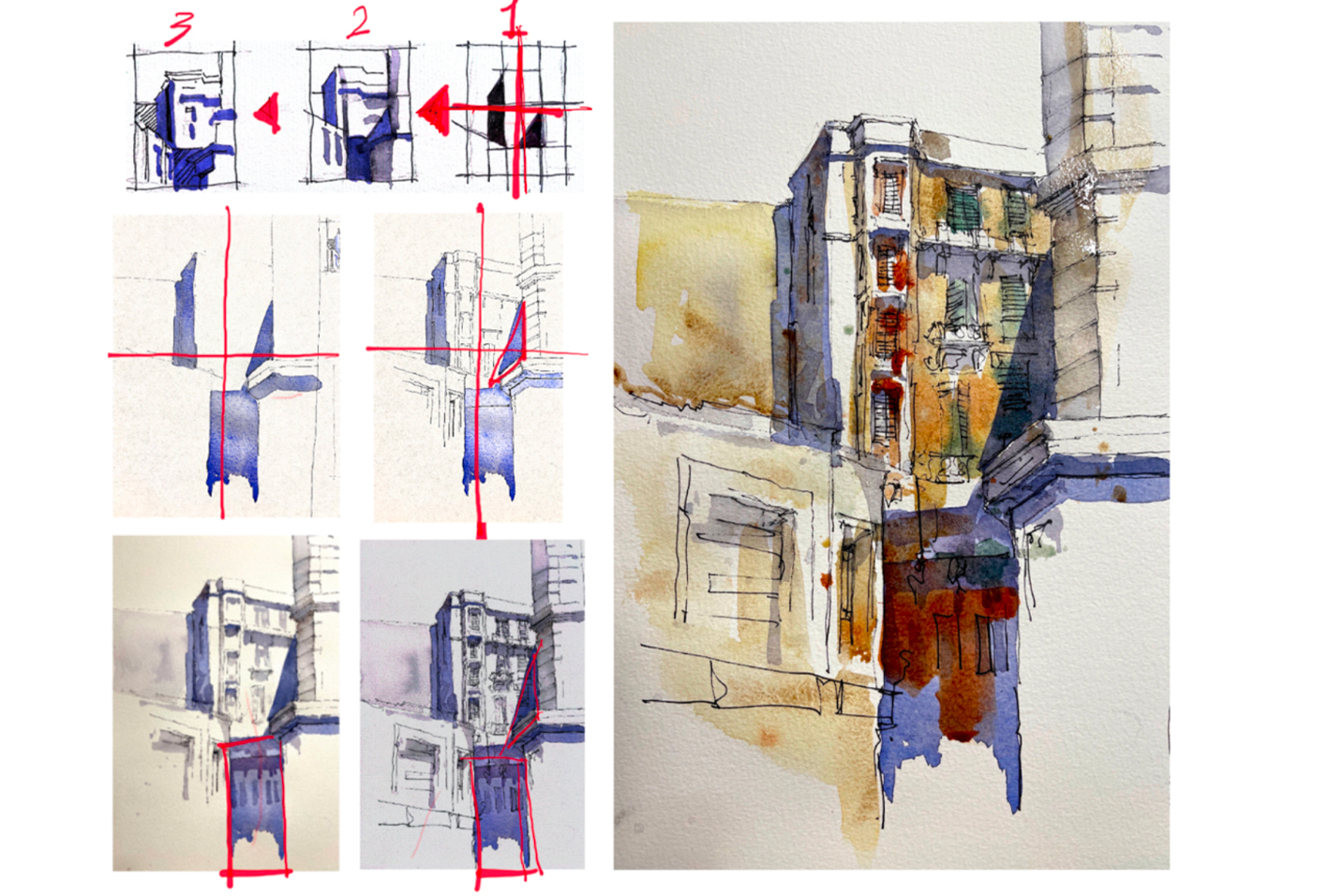 Male eine komplexe Szene, insbesondere bei klassischer Architektur, ohne dich von Details, Ornamenten und komplizierten Stilelementen überwältigen zu lassen! Es gibt viele Strategien zur Vereinfachung dieser Art von Szenen, so dass wir den Moment einfangen, eine Geschichte erzählen und den Sinn des Ortes offenbaren können, ohne uns zu sehr in Details zu verstricken: Eine dieser Strategien ist die Vereinfachung der Szene mit Schatten, nicht mit Linien. Licht und Schatten sind unsere Hauptakteure.